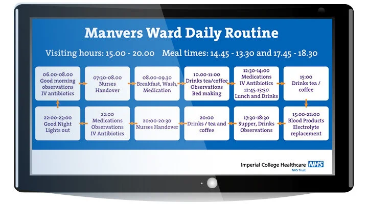 This second message from Imperial College Healthcare is also a great addition to the ward screen genre. It gives a somewhat detailed breakdown of what the daily routine is on the ward, letting patients know what to expect and when to expect it. Also useful for visitors who aren’t used to a hospital environment.