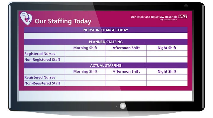 Also on the topic of staffing from Doncaster and Bassetlaw Hospitals NHS Foundation Trust is this one which shows clearly and publicly how many staff are one the ward, vs how many were planned to be there. It uses an RSS fees so that the hospital can edit it themselves as often as they need to, making it an efficient and easy way to bring safety statistics into the ward environment.